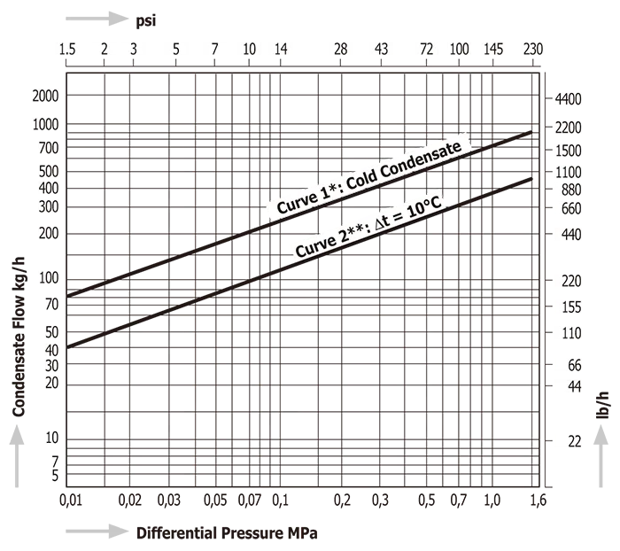 ●Минимальный перепад рабочего давления (⊿PMN): 0,1 бар ⊿PMN — это минимальный перепад рабочего давления между впуском и выпуском конденсатоотводчика.